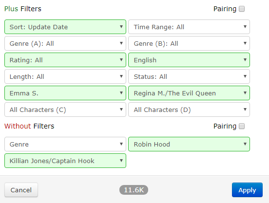 As an example, the above filters would increase the likelihood of finding stories with Swan Queen while also reducing the chance of running into either Captain Swan or Outlaw Queen.